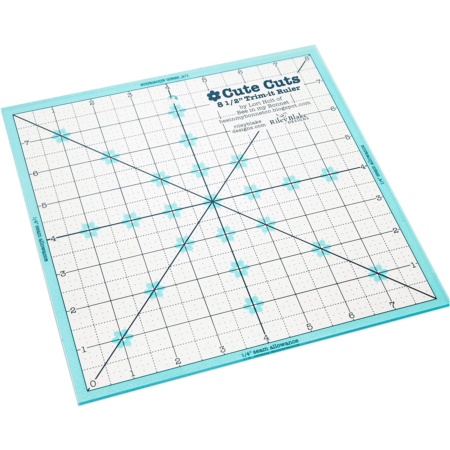Riley Blake Designs by Lori Holt - Trim-It 8.5" X 8.5" square ruler which features a .25" seam allowance marked in aqua. Markings printed in at 1 inch, 1/2 inch and 1/4 inch increments. Use the vertical, horizontal and diagonal lines to perfectly align and trim blocks.